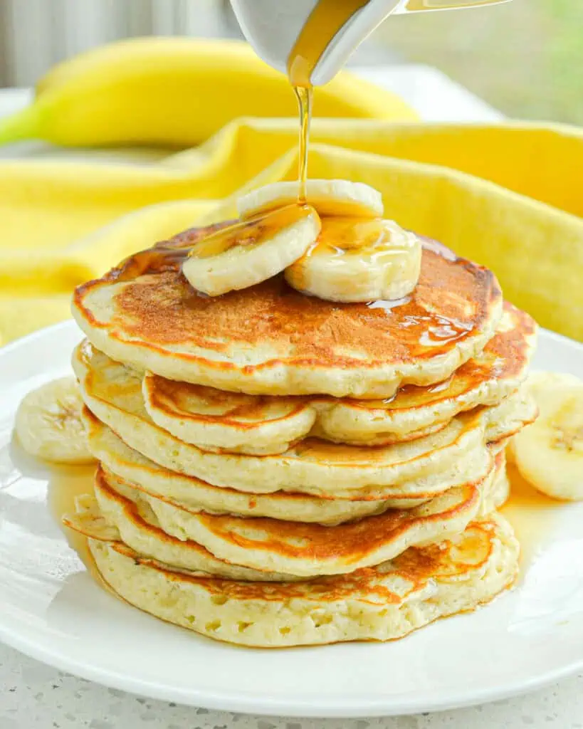 Banana Pancakes are a fantastic way to get that moist banana bread taste in easy-to-make small-portioned pancakes. These light fluffy made from scratch buttermilk pancakes with all-natural banana flavor, vanilla, and a touch of cinnamon are hard to resist. Serve with warm maple syrup and savor the memories of great breakfasts with your parents and grandparents.