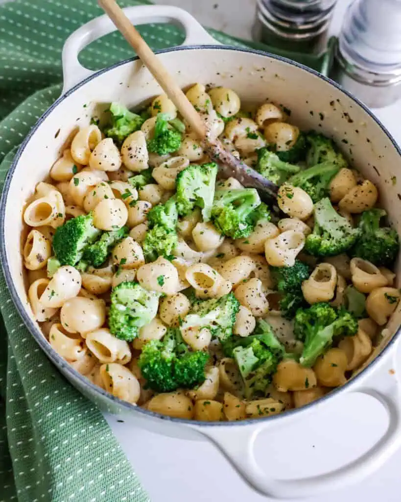 This quick and easy one-pot broccoli pasta combines shell pasta and broccoli in a creamy Parmesan cheese sauce seasoned with garlic and dried Italian herbs. This delicious side dish is perfect with chicken, beef, or pork. Or serve on its own as a hearty vegetarian meal.
