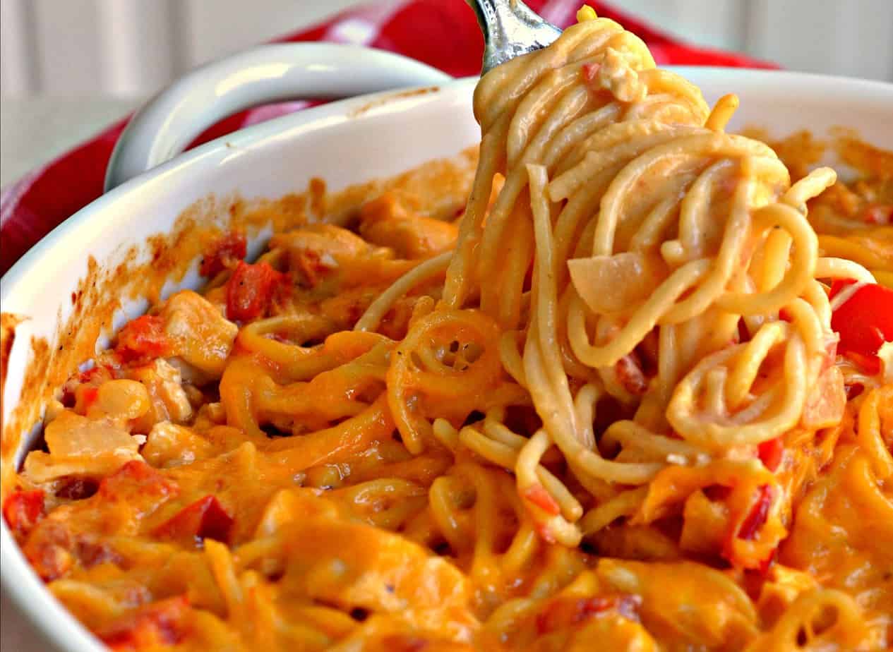 Now add the cooked drained spaghetti to a casserole dish. Next pour the chicken cheese mixture over the spaghetti. Then top with remaining shredded cheddar cheese and bake until the cheese is melted and the casserole is heated through,