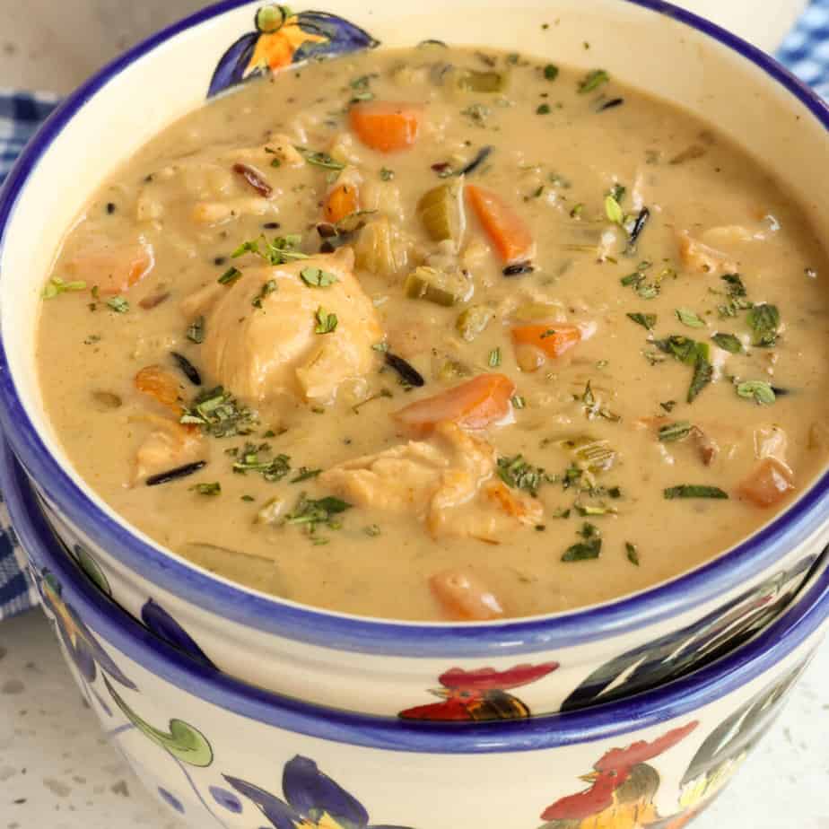 Melt a little more butter in the pan on the stovetop. Add the diced onion, celery, and carrots and cook until the onions and celery are soft. Reduce the heat to low and add the garlic, dried thyme, crushed rosemary, marjoram, and jasmine rice. Cook for 1-2 minutes while stirring to toast the rice. Stir in the chicken broth and bring the mixture to a boil. Reduce the heat to a simmer, add the browned chicken, cover, and simmer for 20 minutes without lifting the lid. Remove from the heat and let it sit for 5 minutes without removing the lid. Then, fluff the dish using a fork.