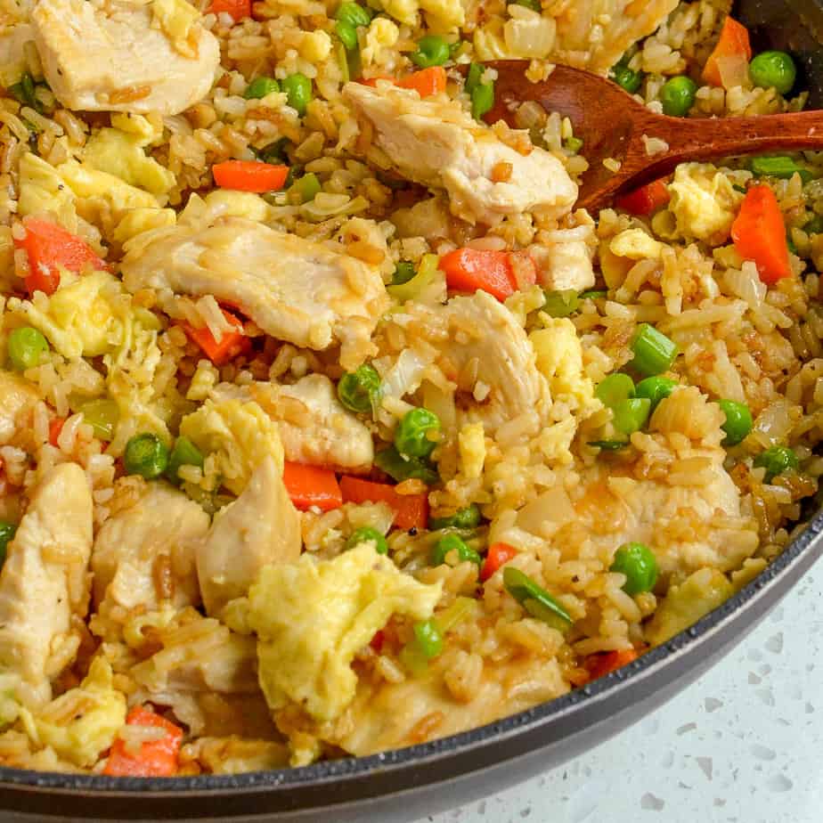 This easy chicken fried rice is loaded with golden brown chicken, sweet onions, carrots, peas, eggs, and green onions and tastes so much better than your favorite Chinese takeout. You don’t know how good fried rice can be until you make it in your own kitchen.