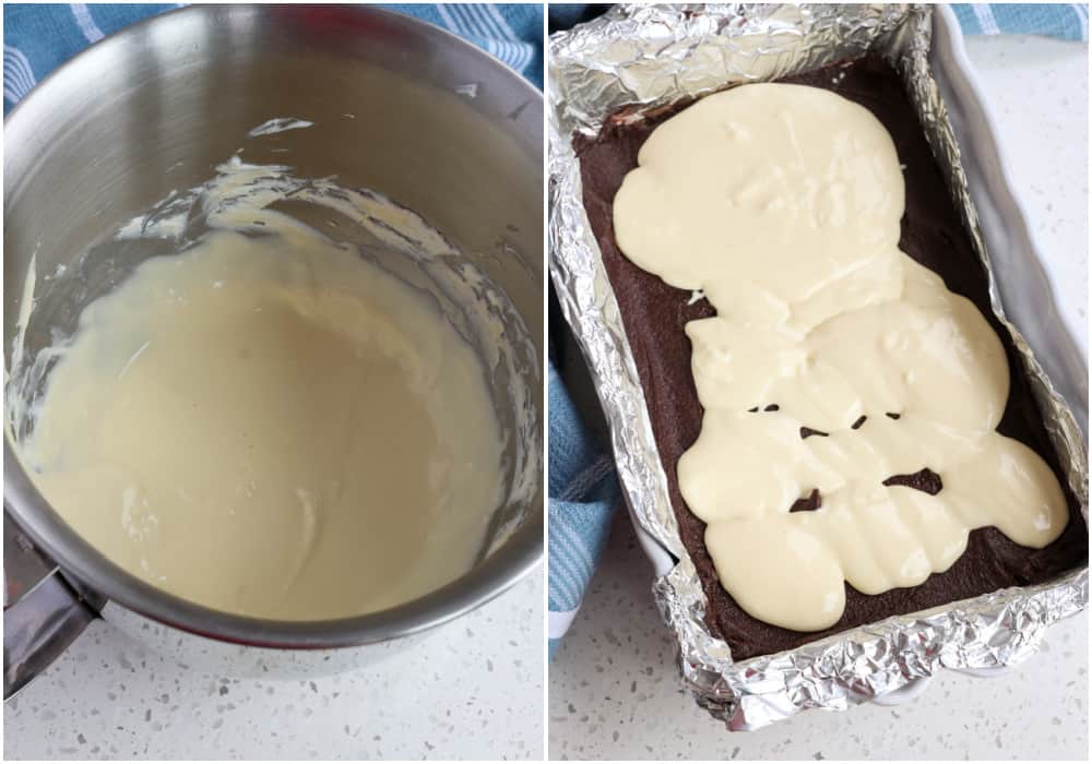 - Using a stand mixer or a hand mixer on medium speed, beat the cream cheese and sugar until creamy. Reduce the mixer speed to low and add the egg and vanilla extract, mixing until combined. Using an offset spatula, spread the cream cheese mixture over the brownie mixture.