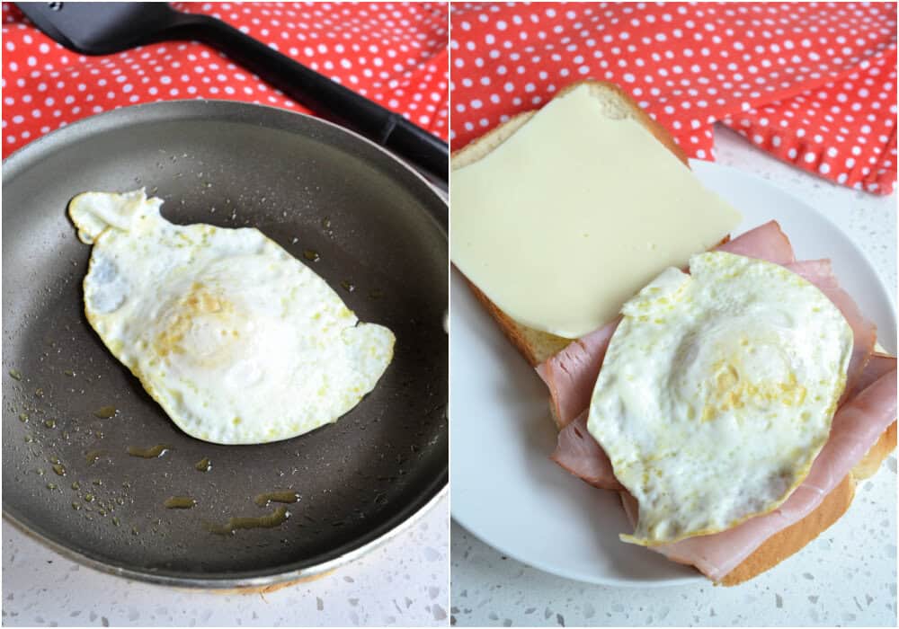 - Place one slice of white American on one side of the bread and place one slice of yellow American on the opposite slice. Top each side with a thin piece of honey ham. Have sandwiches assembled so as you remove the eggs from the pan you are ready to go.