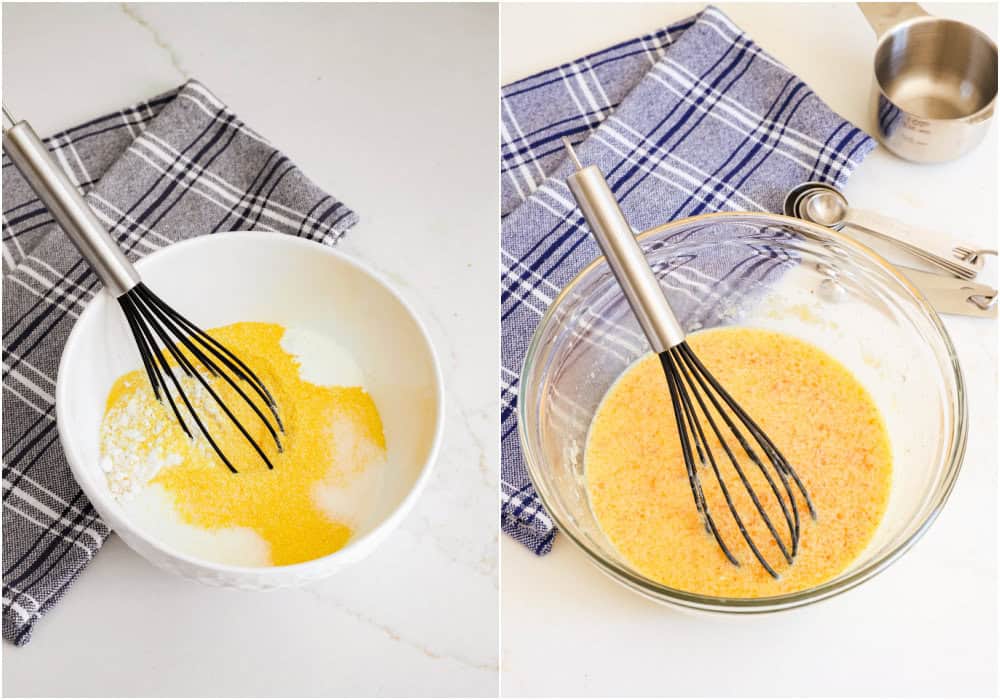 - In a medium bowl whisk together the flour, cornmeal, baking powder, sugar and salt.