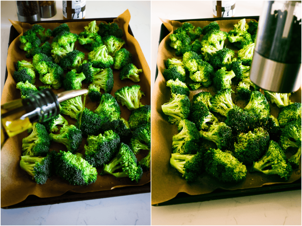 - Spread the broccoli in a single layer on the prepared baking sheet. Drizzle with olive oil. Generously sprinkle with salt and freshly ground black pepper.