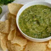 A flavor packed Salsa Verde Recipe made with fresh roasted tomatillos and jalapenos, onion, garlic, cilantro, and lime juice. One taste and you will never go back to store bought.