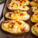 Twice Baked Potatoes are a classic side to add to just about any meal, from steak to sandwiches, chicken, and more—delicious, creamy potatoes topped with crispy bacon, scallions, and sour cream.