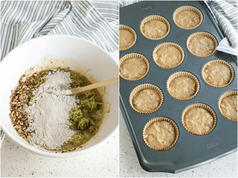 - Finely grate the zucchini so the muffins are speckled with fine bits of zucchini in every bite. Don’t worry about squeezing the moisture out of the zucchini.
